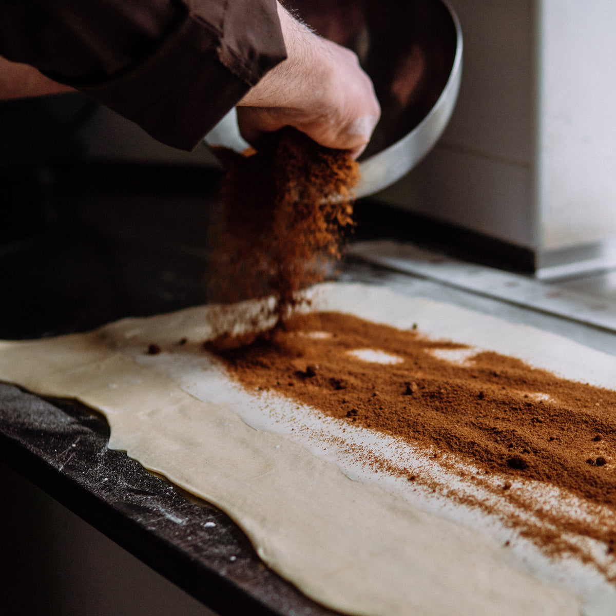 L'impasto non è aromatizzata alla cannella, bensì questa viene aggiunta solo in fase di stesura;